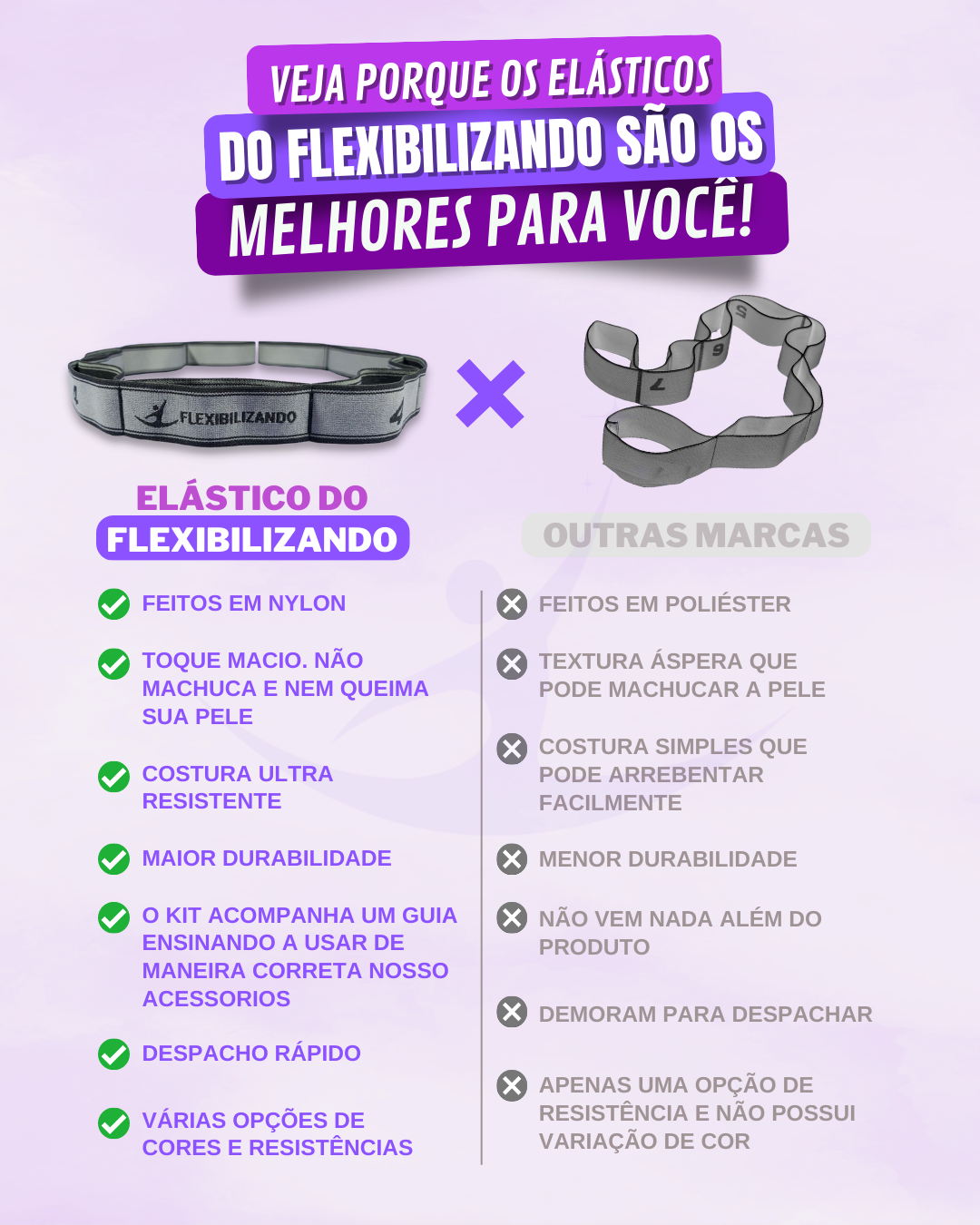 Com os elásticos, você poderá ganhar mais amplitude nos seus exercícios sem precisar de uma pessoa forçando. Além disso, com o uso correto os treinos com o elástico ajudam a melhorar o alinhamento nas posições e execução. Com o elástico para flexibilidade você também vai melhorar sua força e equilíbrio.